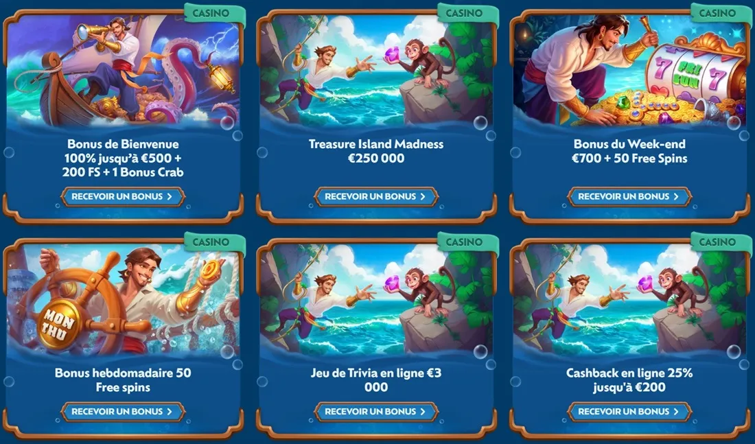Lâinscription sur ce site dĂ©clenche automatiquement le bonus du casino Winbay de bienvenue. Il sâagit dâun boost dâune valeur de 100 % Ă hauteur de 500 ⏠+ 200 free spins + 1 bonus Crab. Ce nâest pas mal pour un dĂ©but dâaventure.